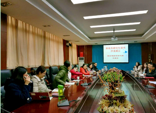 2016年11月25日下午,第一次读书沙龙在财经主楼8楼国际交流厅召开,主题为“财政系研究生读书沙龙成立暨宏观经济学心得交流会”。邓晓兰教授、王俊霞教授、李彬副教授等多位博导莅临会场。会议伊始,邓教授致辞,宣布财政系研究生读书沙龙正式成立。