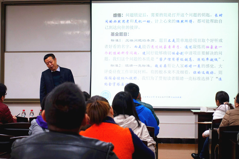 教师科研能力,做好2018年度国家社科基金和自科基金项目申报工作,提高项目申报质量和中标率,学院邀请大连理工大学迟国泰教授专场辅导2018年度国家基金项目申报。