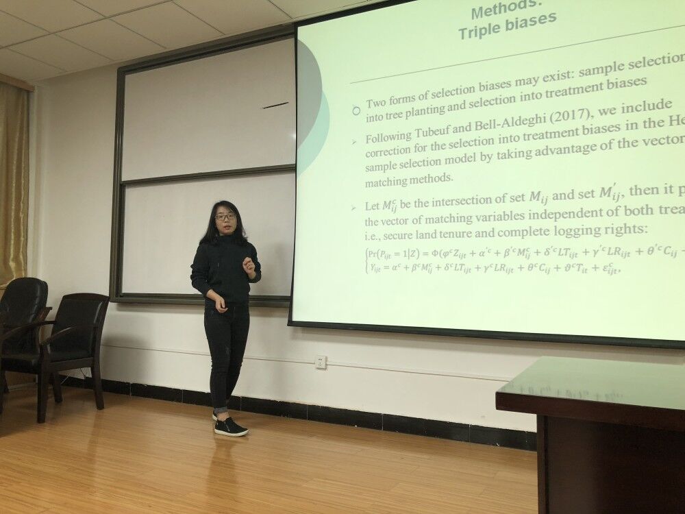 该成果以通过比较地理环境较为相似的我国湖南省和美国阿拉巴马州之间森林密度、碳储量以及碳吸存率之间的差异,阐述了林业产权制度对于林业发展的重要性。同时,林颖老师详细介绍了中国集体林权改革的历史沿革以及林业生产和农业生产的周期性区别,初步分析了林权改革对农户行为的可能影响。其次,林颖老师就如何构建实证研究的框架展开了重点说明,深入浅出地为我们分析了林地产权、林木采伐权不同分配方式可能引起的造林投入差异。随后,林颖老师讲述了根据变量特征选择合适的模型估计方法,综合运用匹配方法和Heckman模型,能够有效控制农户自选择以及样本选择性偏误,得到林地产权和林木采伐权对农户造林投入影响的无偏估计量。该研究的主要结论是林木采伐权稳定性提高能够显著促进农户造林投入,而地权稳定性的影响则不显著。