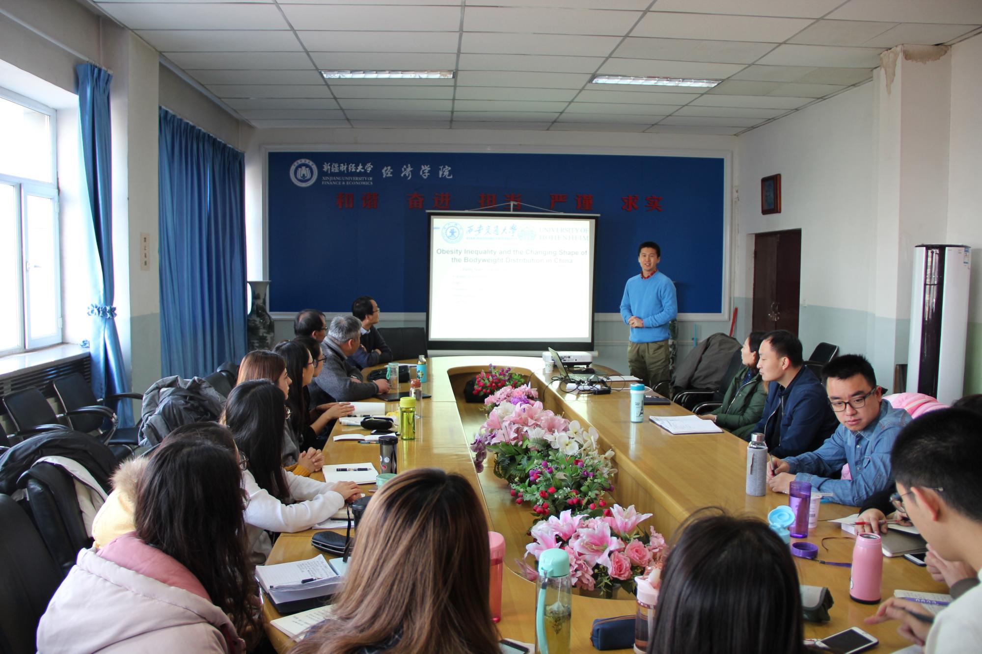 14日上午,聂鹏副教授做了题为《从发展经济学视角探究中国成年人体重分布与肥胖不平等变动及成因》的报告。报告会由新疆财经大学经济学院副院长马远副教授主持。新疆财经大学经济学院党委书记敬莉教授、院长助理石天戈副教授、教研室主任苏来曼·斯拉木副教授、刘雅轩副教授和经济学院研究生30余人参加报告会。该报告主要基于经济发展的核心是社会和个人的福祉改善。个人福利的衡量是一个多维的指标体系,除收入之外,还包括健康、营养、就业和教育等指标。而目前个人不平等问题更多关注个人收入。作为衡量个人福利的重要指标之一,肥胖不平等能够有效度量不同个人之间的资源(如食物)配置。 因此,本报告从发展经济学视角分析了1991至2011年中国成年人群体的体重分布与肥胖不平等变化及成因。报告会后,针对老师和同学们提出的有关肥胖不平等的分解技术、区域间不平等的差异性等问题,聂鹏副教授都逐一进行详细解答。