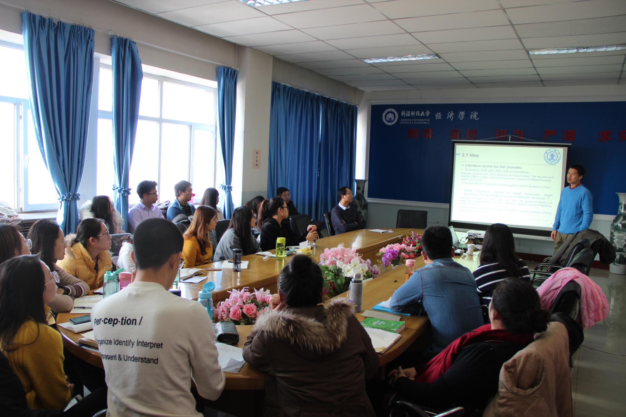 14日下午,聂鹏副教授做了题为《对经济学研究生如何进行科研的一些思考》的报告,以期帮助和引导经济学及相关专业的研究生如何有效地开展学习与科研。报告会由新疆财经大学经济学院副院长马远副教授主持。报告主要包括两个板块:第一,对德国研究生的学习与科研进行一个简要介绍;第二,重点探讨经济学研究生在进行有效科研中所需要考虑的一些主要方面,包括研究主题、数据,专业论文写作、软技能培养、批判性思维、学术出版等。并对现代计量经济学中的非参数与半参数方法及在经济学研究中的具体应用进行了介绍。报告会结束之后,参加报告会的同学们与聂鹏副教授进行了愉快的交流。