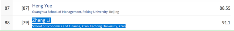 李铮教授进入了中国地区经济学家/研究者前100强(李铮教授的排名(Rank)和加权排名(W.Rank)分别为88和79);该排名是根据学者过去10年的学术论文发表及其影响确定的。李铮教授是西安交大首位进入该排名中国前100强以及亚洲前500强的学者。