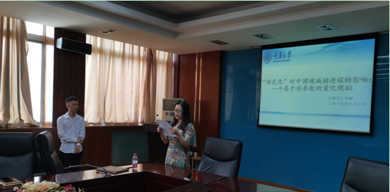 9月6日上午,丰超博士首先为大家做了学术报告,他报告的题目是“‘绿色化’对中国碳减排进程的影响:一个基于非参数的量化模拟”,报告以减排行为视角,研究了环境规制对碳排放绩效的影响存在"双门槛"效应。报告后,丰超博士与参会师生们进行热烈的互动交流。