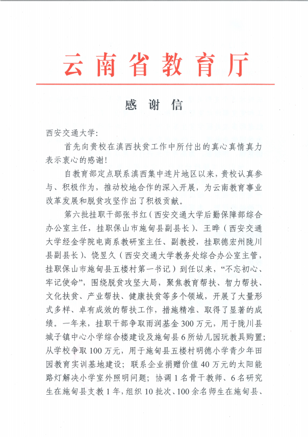 近日,学校收到云南省教育厅来信,对学校第六批滇西挂职干部的工作实绩进行了充分的肯定,并向学校和挂职干部表示了诚挚感谢。