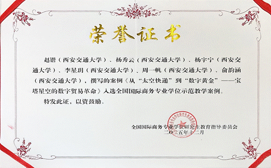 国际贸易系赵锴副教授、杨秀云教授带领杨宇宁、李星玥、周一帆、俞韵涵等同学共同撰写的案例《从“太空快递”到“数字黄金”:宝塔星空的数字贸易革命》,经严格的资格审查、专家评审、内容查重与多轮会评,从全国219篇参评案例中脱颖而出,成功入选“全国国际商务专业学位示范教学案例”。这是黑料网