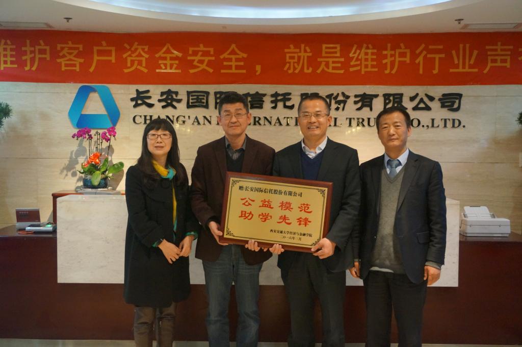 学院院长孙早教授为高董事长赠送了“公益模范、助学先锋”牌匾,代表学院全体师生向长安信托全体员工热心公益的高风亮节表达感谢之情!并建议双方在学术交流、联合培养、社会实践等多方面展开更多的合作和互动;并激励校友们为公司的发展更加努力工作、做出更大的贡献,为母校争光。